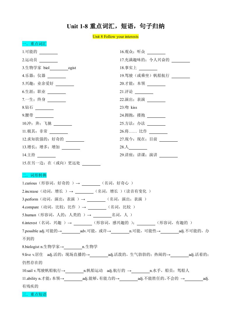 七下英语专题01 Unit 1-8重点词汇,短语,句子归纳(沪教牛津)(含答案)QXYYHJ-0248