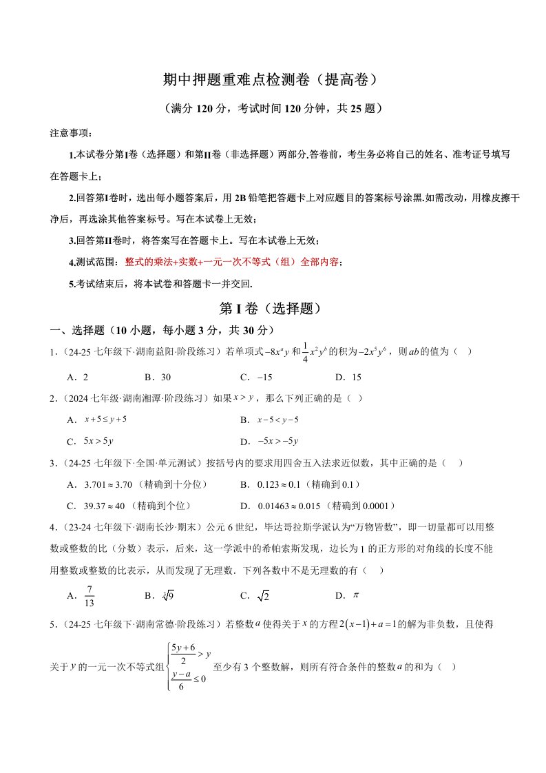 七下数学 期中押题重难点检测卷(提高卷)(考试范围:整式的乘法+实数+一元一次不等式(组)全部内容)-(湘教版)(含答案)QXSXXJ-0223