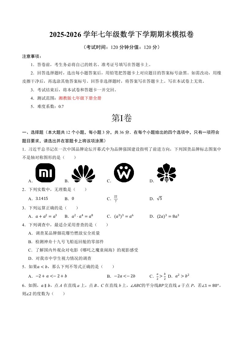 七年级数学期末模拟卷【测试范围:湘教版七年级下册全册】(含答案)QXSXXJ-0234