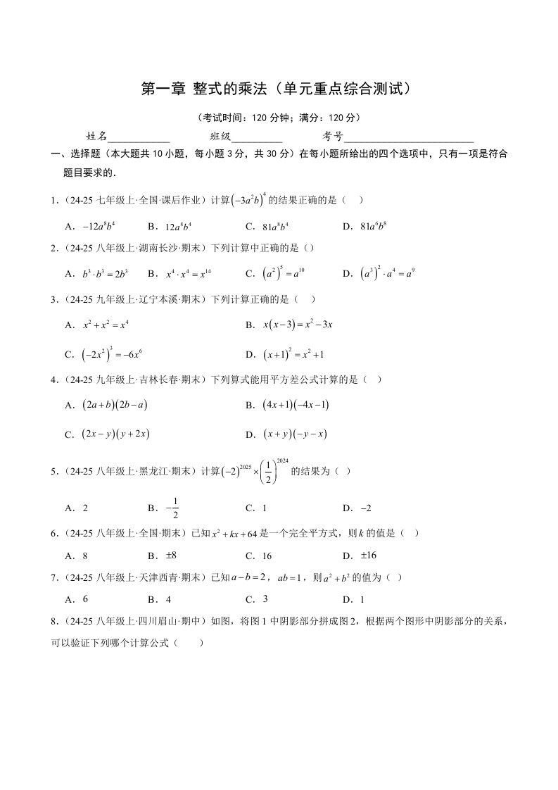 七下数学湘教 第一章 整式的乘法单元测试卷(含答案)QXSXXJ-0095
