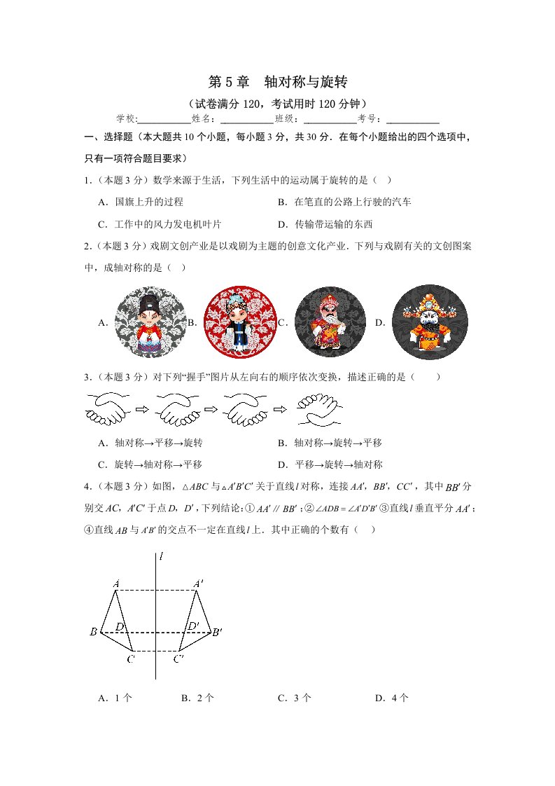 七下数学 第5章 轴对称与旋转(单元测试,湘教版)(含答案)QXSXXJ-0090