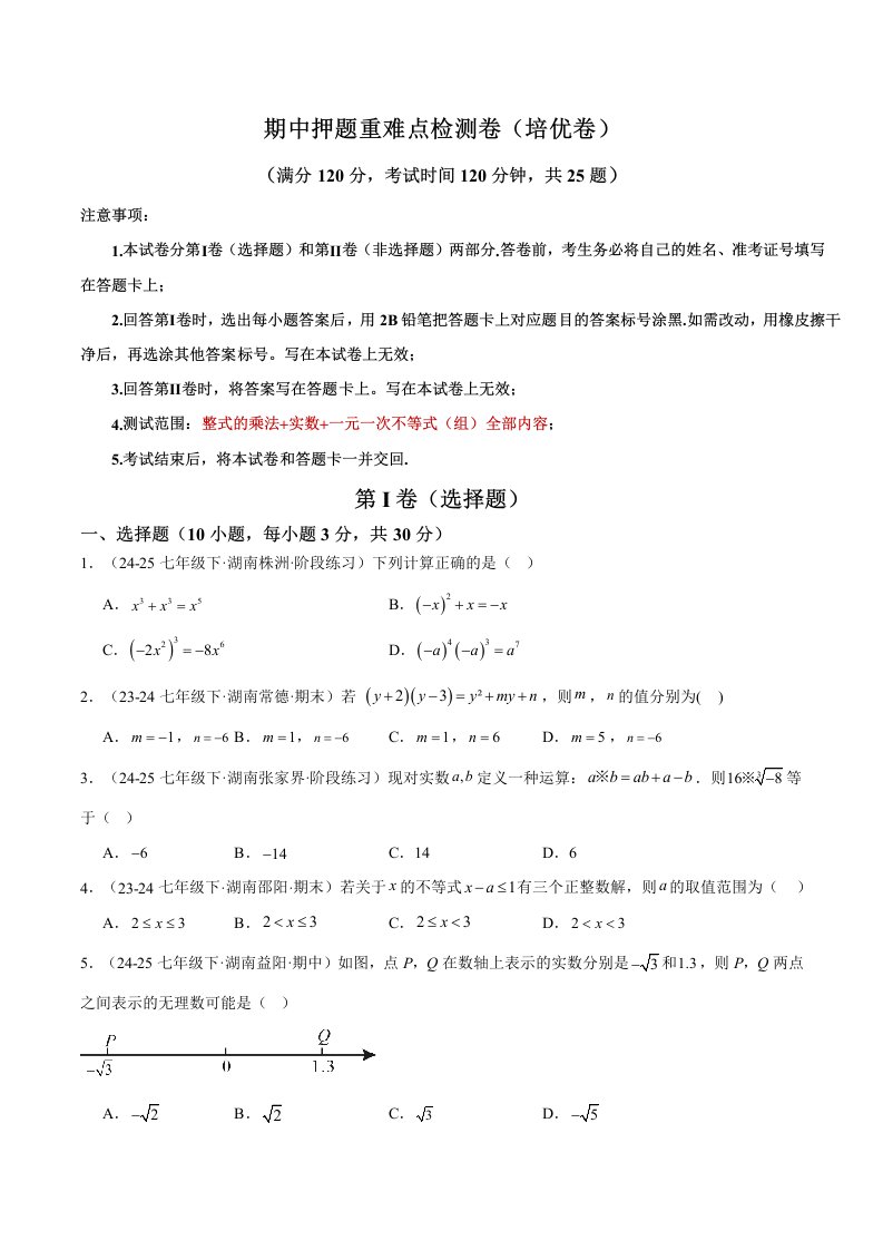 七下数学 期中押题重难点检测卷(培优卷)(考试范围:整式的乘法+实数+一元一次不等式(组)全部内容)-(湘教版)(含答案)QXSXXJ-0226