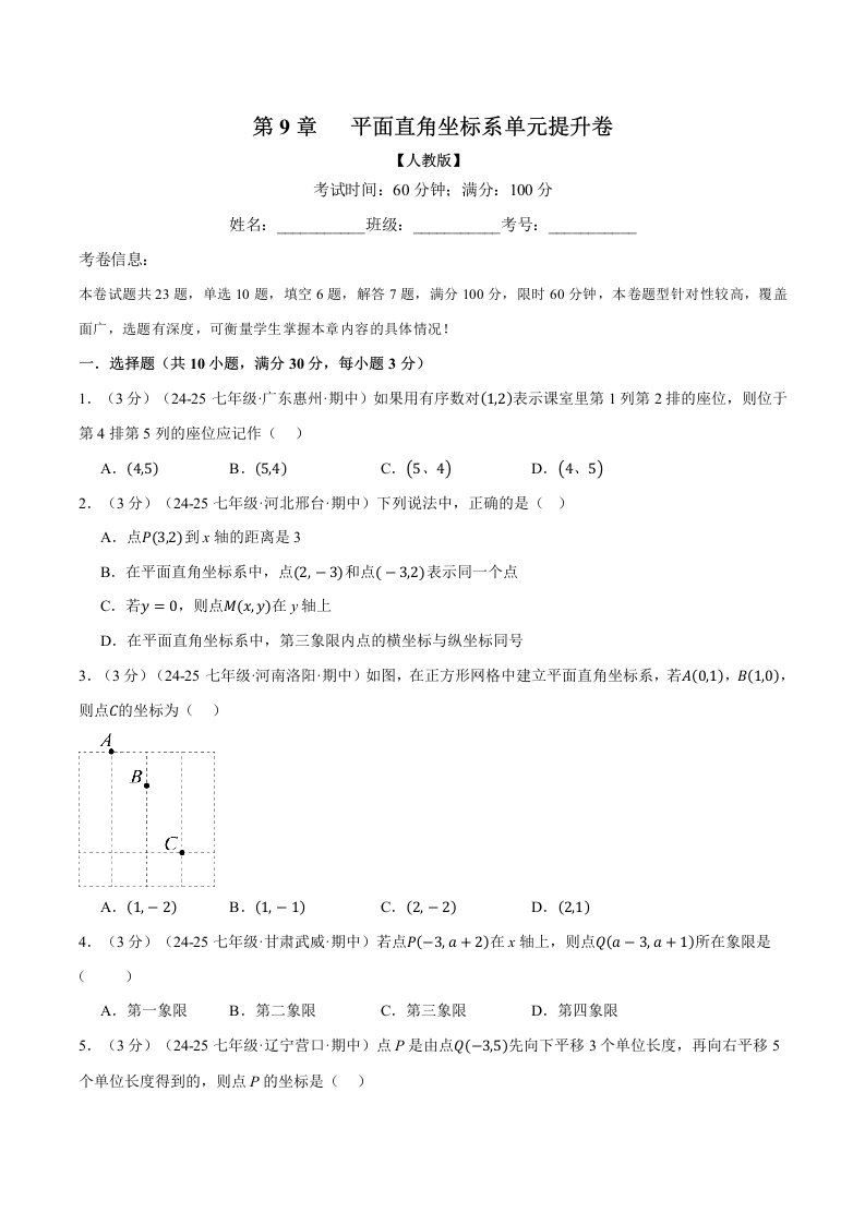 七下数学 第九章 平面直角坐标系单元测试(基础卷)(含答案)QXSXRJ-0055