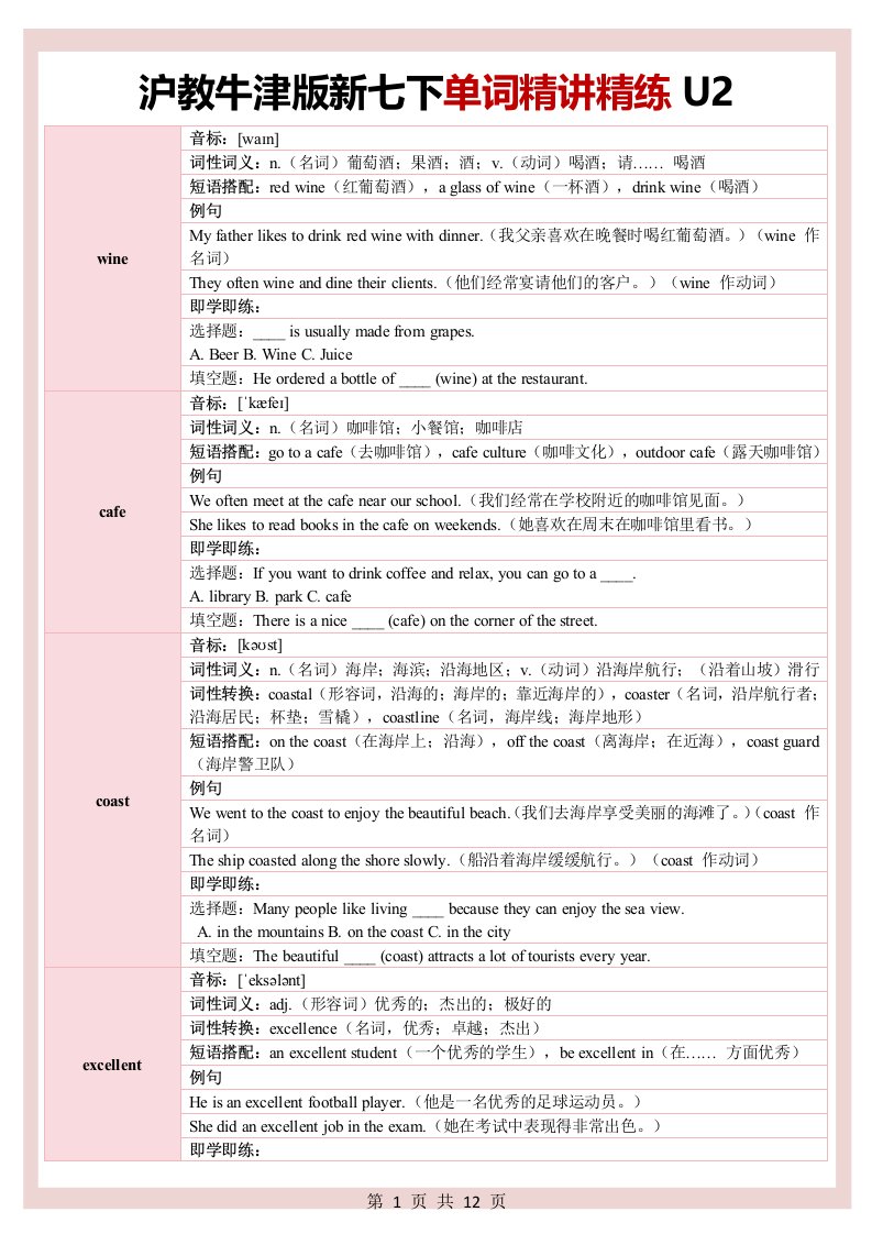 新七下英语沪教牛津 单词精讲精练U2(含答案)QXYYHJ-0067