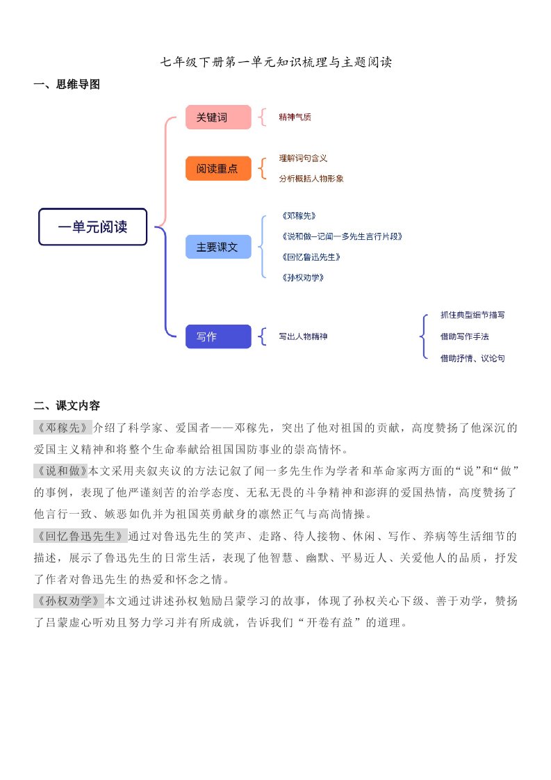 七年级下册第一单元知识梳理与主题阅读(学生版)(教师版)QXYWBB-0190