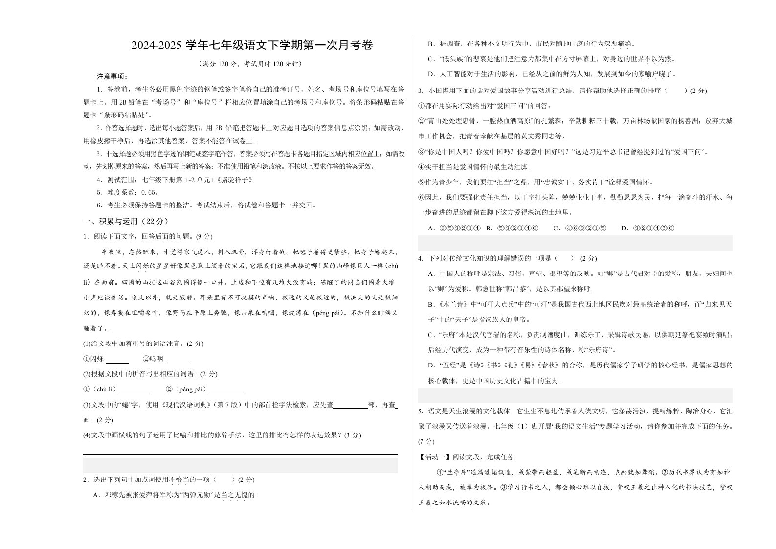 七年级语文月考卷01【测试范围:下册第1~2单元+《骆驼祥子》】(含答案)(统编版通用)QXYWBB-0214