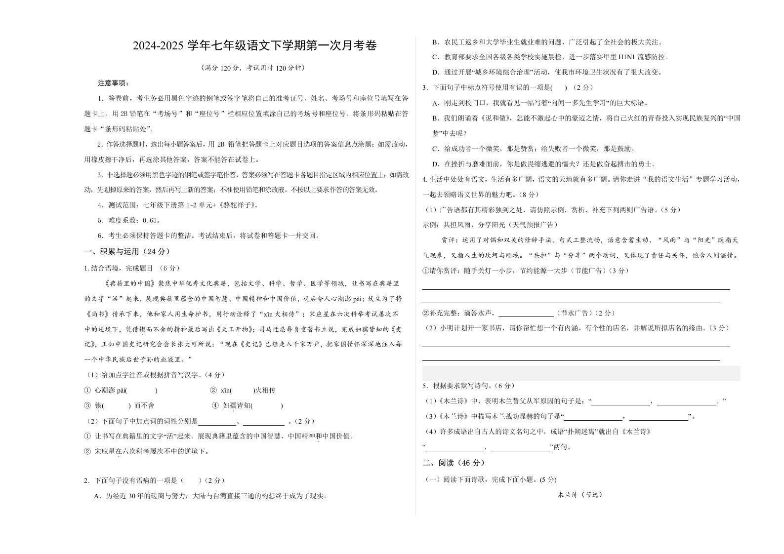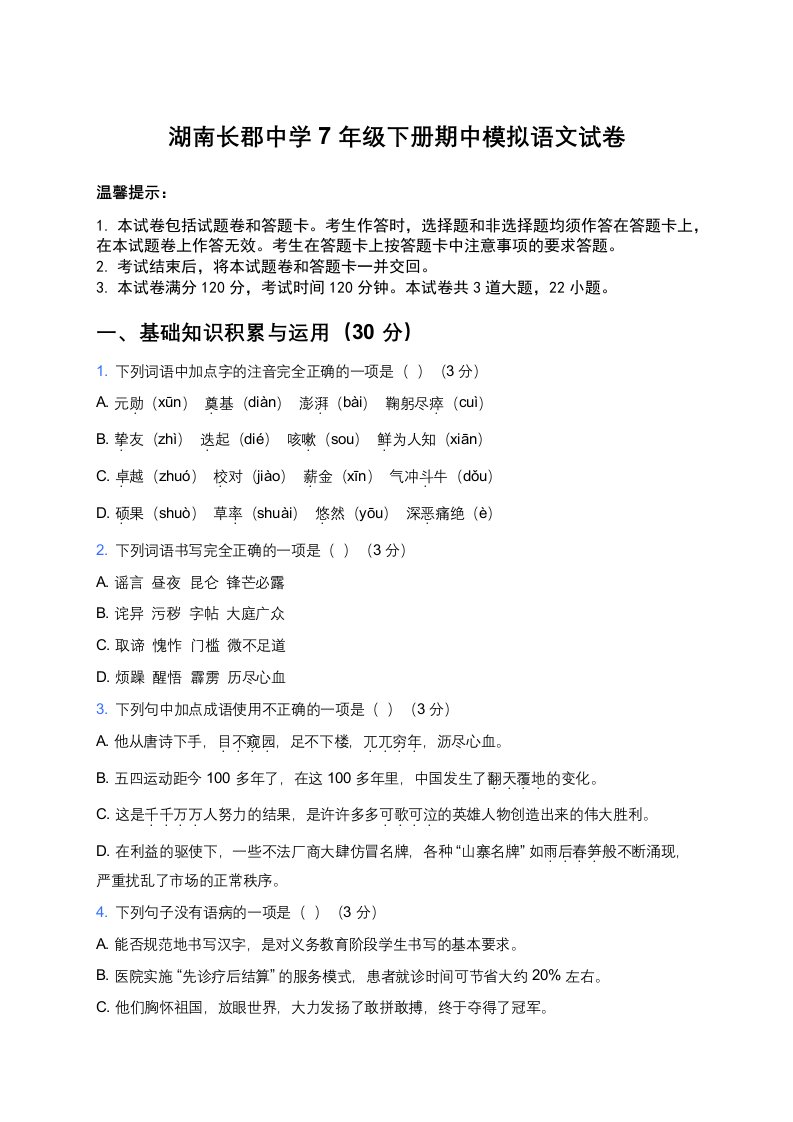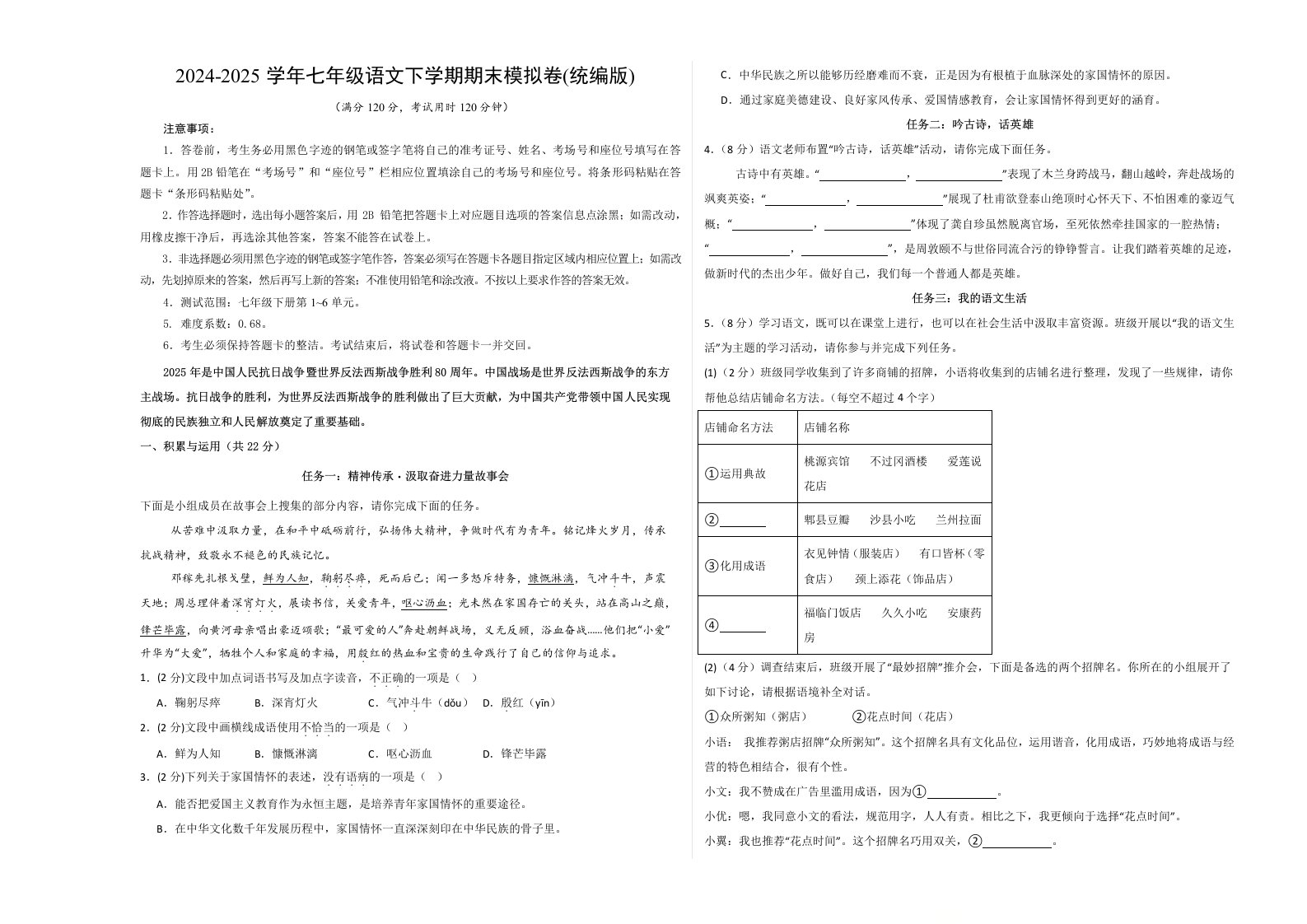 期中模拟语文试卷-统编版语文七年级下册(含答案)QXYWBB-0225