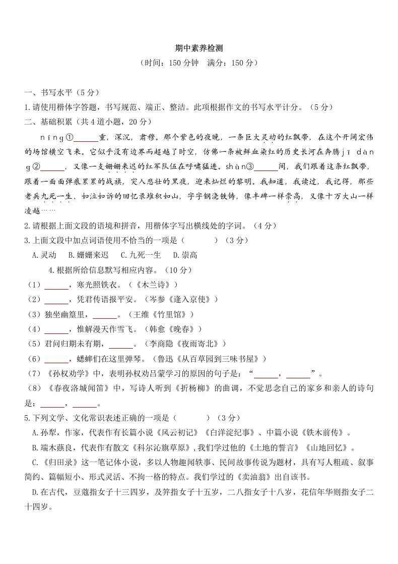 七下语文期中素养检测 - 学生版(含答案)QXYWBB-0228