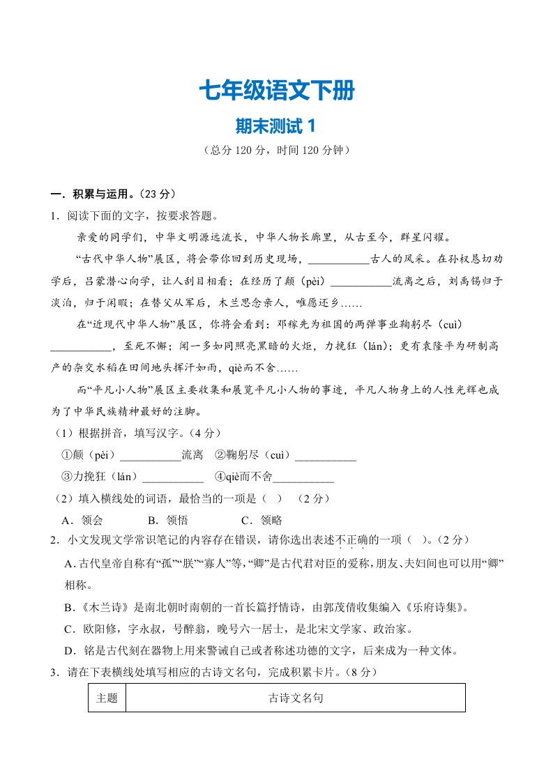七年级下册语文期末综合测试01((含答案))QXYWBB-0251