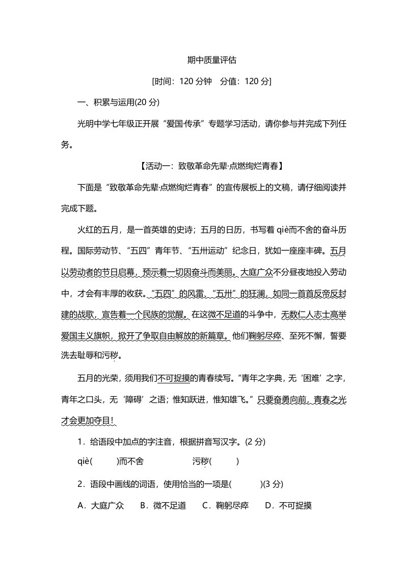 期中质量评估 语文统编版七年级下册(含答案)QXYWBB-0232