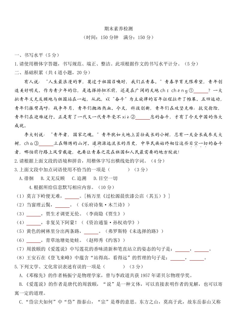 七年级下册语文期末素养检测(含答案)QXYWBB-0249