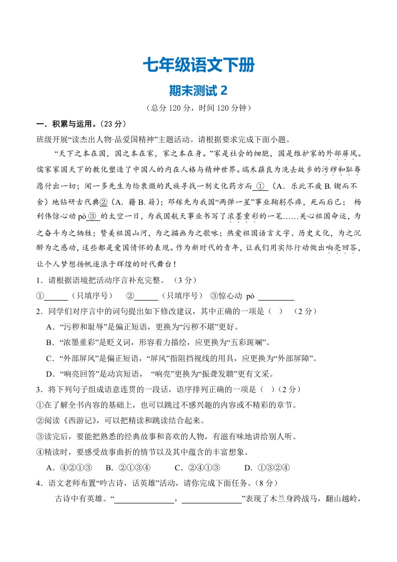 七年级下册语文期末综合测试02(含答案)QXYWBB-0253