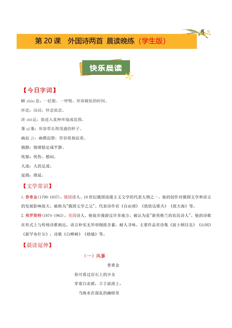 第20课《外国诗两首》(学生版)(学生版)(教师版)QXYWBB-0066