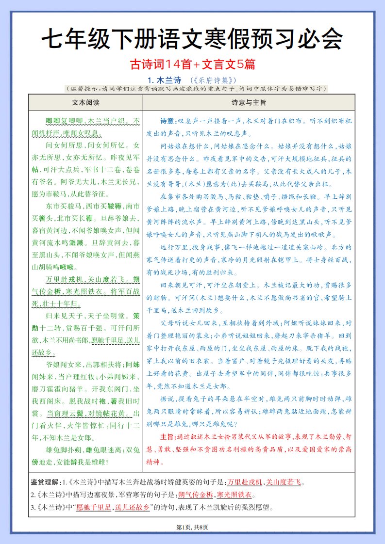 05-七年级下册语文寒假预习必会(古诗文言文)QXYWBB-0265