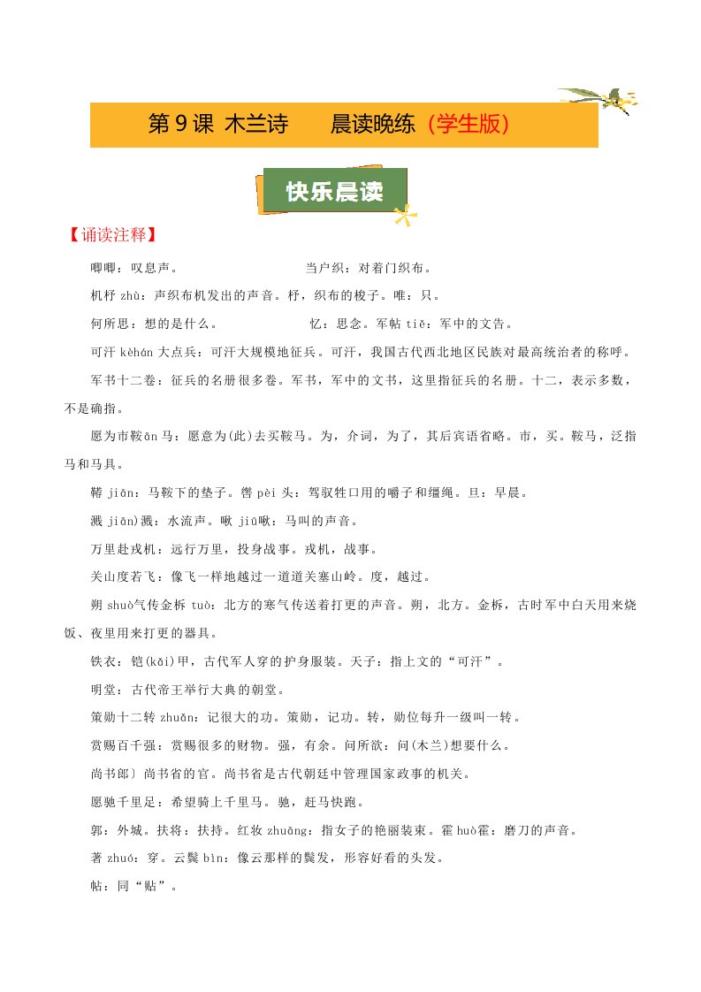 第9课《木兰诗》(学生版)(教师版)QXYWBB-0092