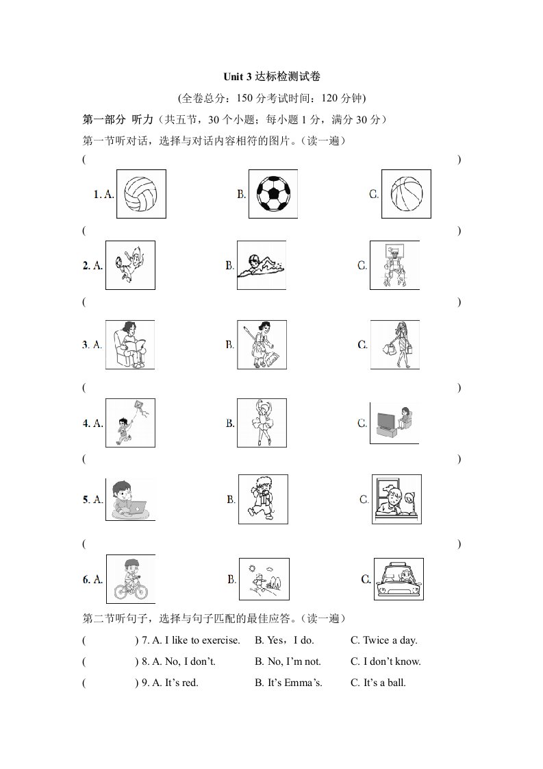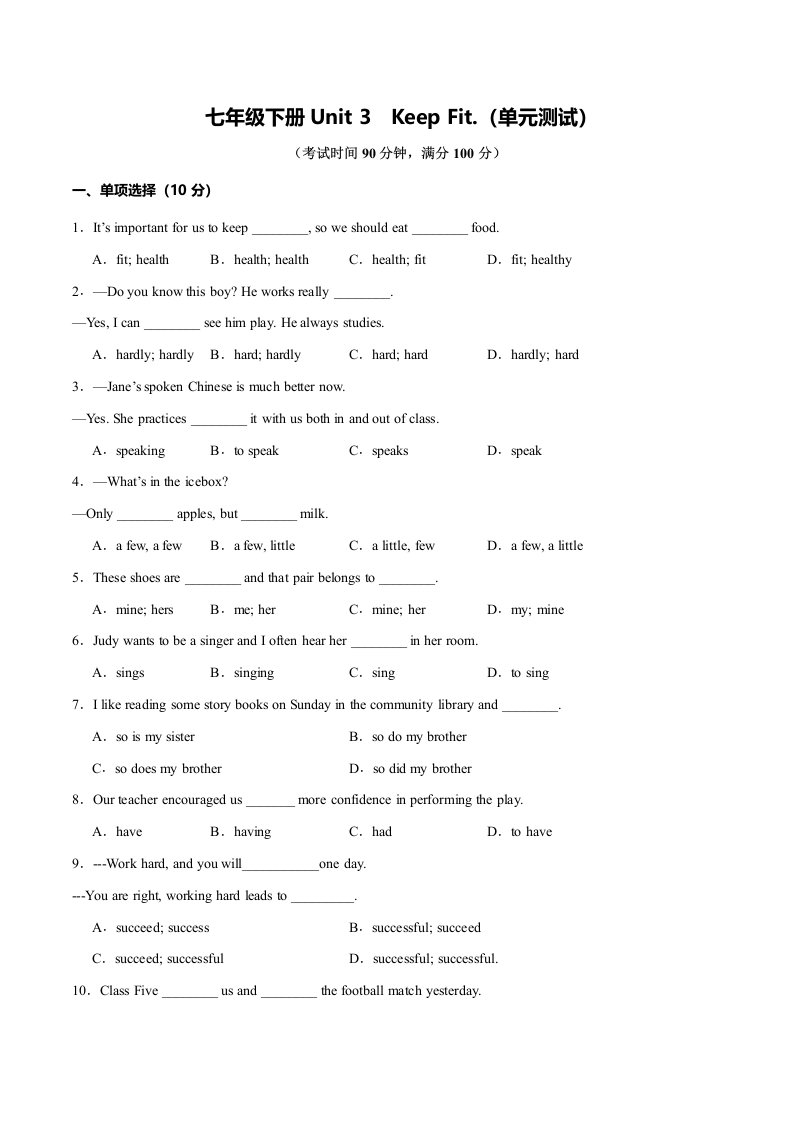 七下英语 Unit 3 Keep Fit . (单元测试)(含答案)QXYYRJ-0194