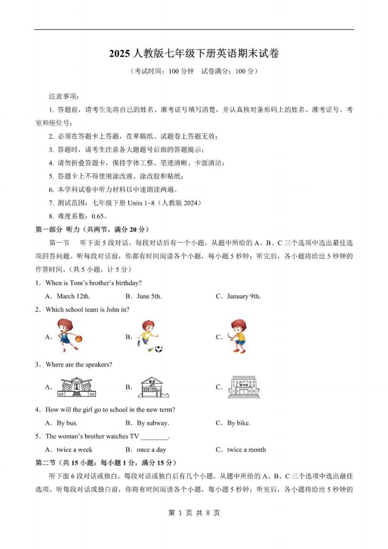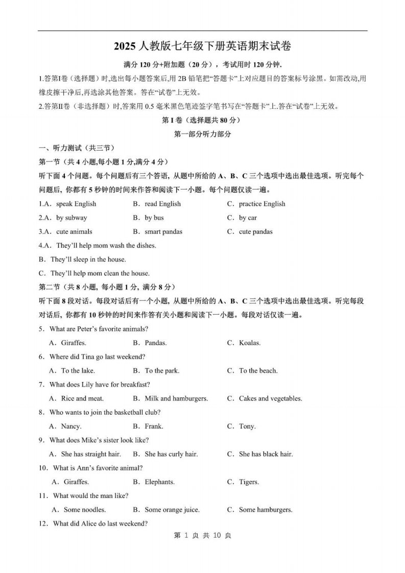 2025人教版七年级下册英语期末试卷( 含答案)QXYYRJ-0275