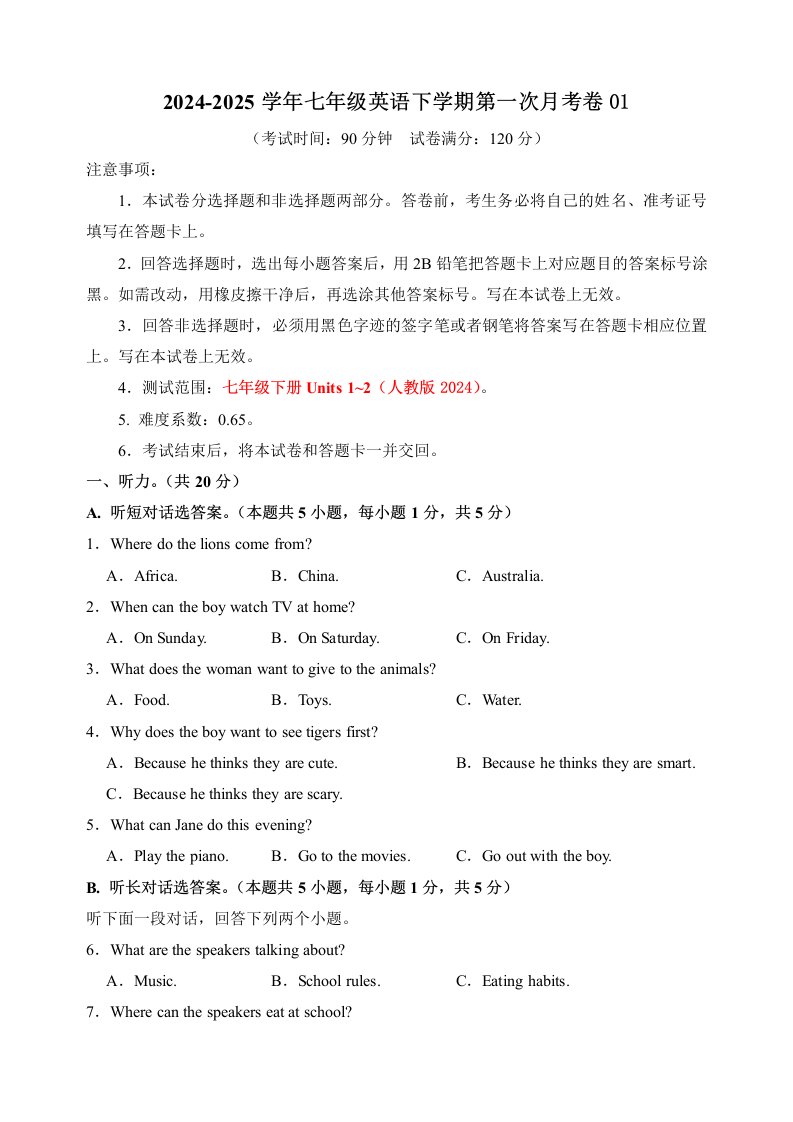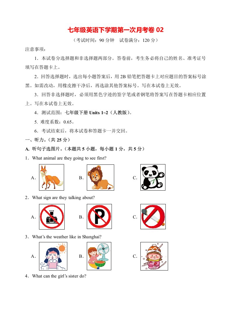 七年级下英语月考卷01【测试范围:人教版七下Units 1~2】( 含答案)QXYYRJ-0251