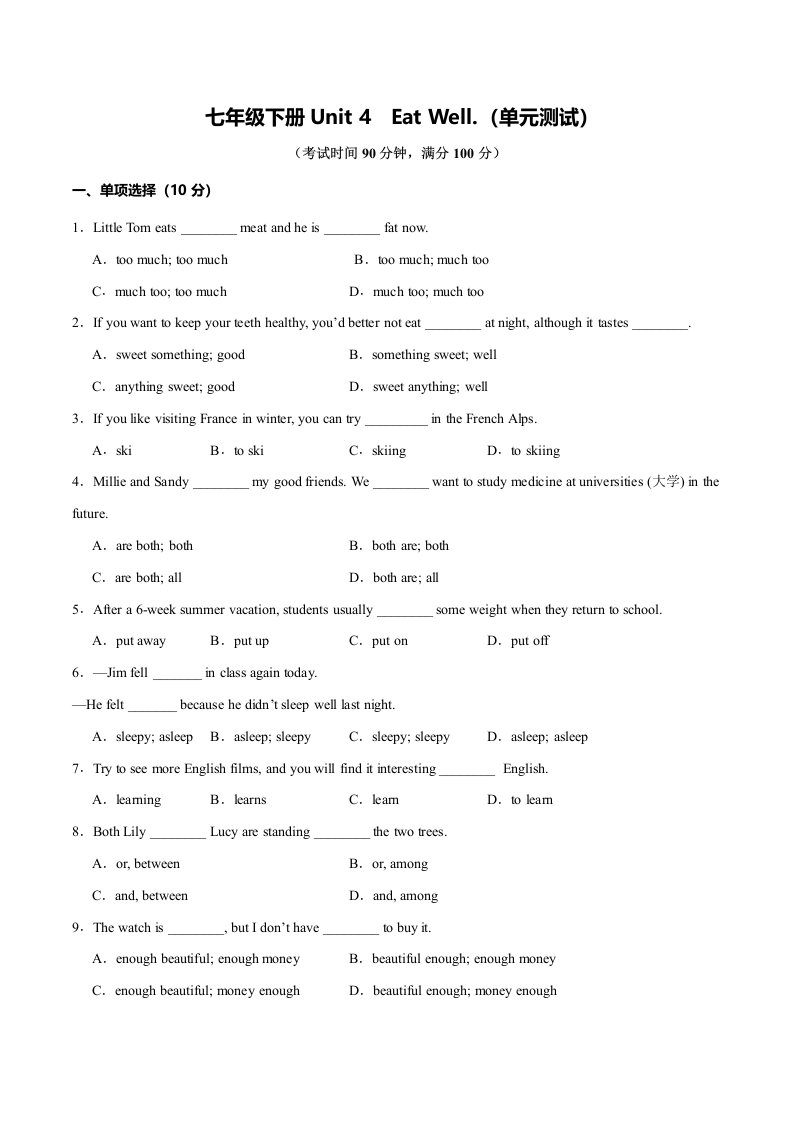 七下英语 Unit 4 Eat Well . (单元测试)(含答案)QXYYRJ-0197
