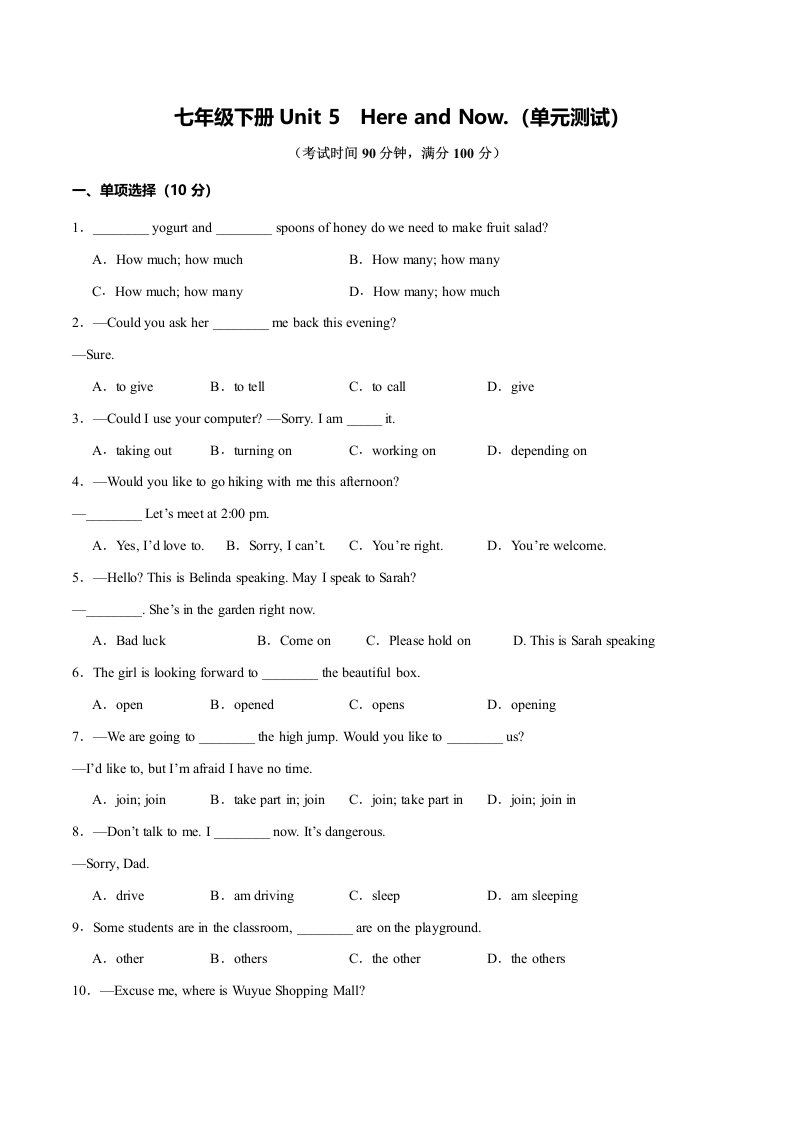 七下英语 Unit 5 Here and Now. (单元测试)(含答案)QXYYRJ-0200