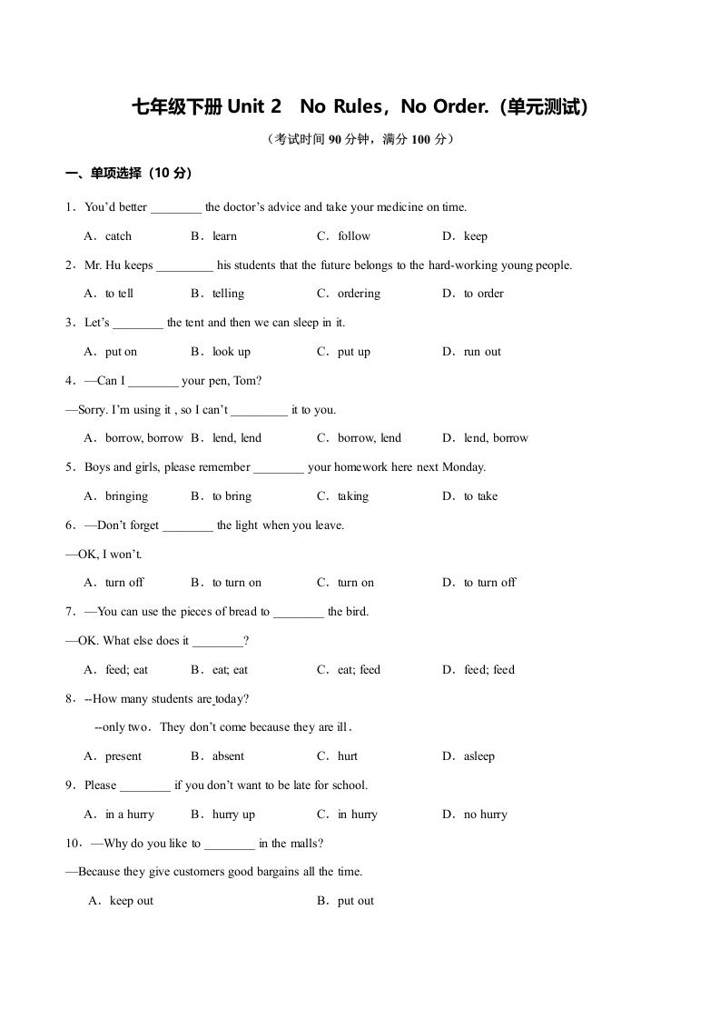 七下英语 Unit 2 No Rules , No Order (单元测试)(含答案)QXYYRJ-0191