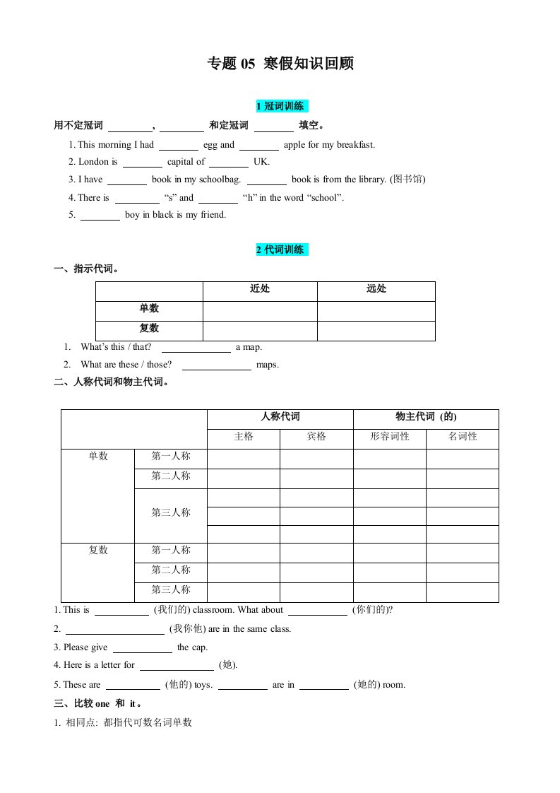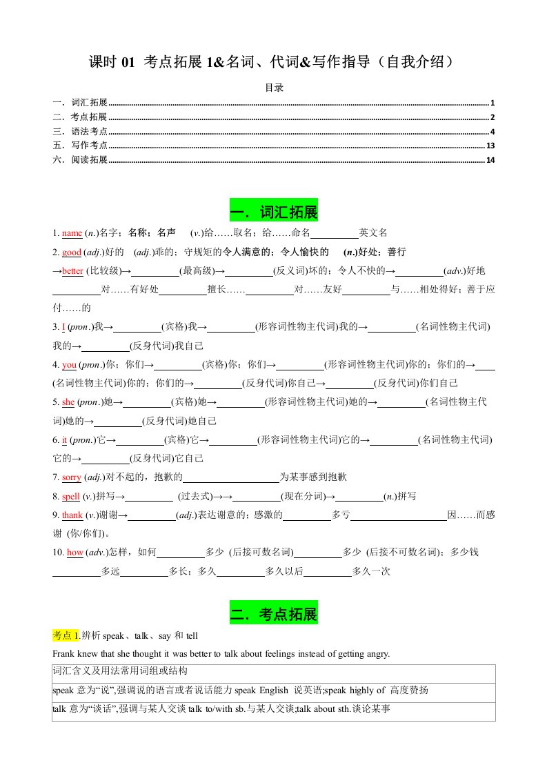 七下英语专题01 考点拓展1&名词、代词&写作指导(自我介绍)(含答案)QXYYRJ-0283