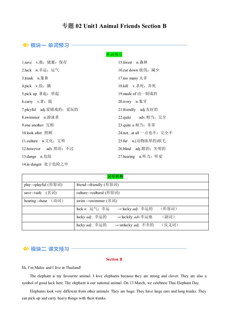 七下英语专题02 Unit1 Animal Friends Section B(含答案)QXYYRJ-0286