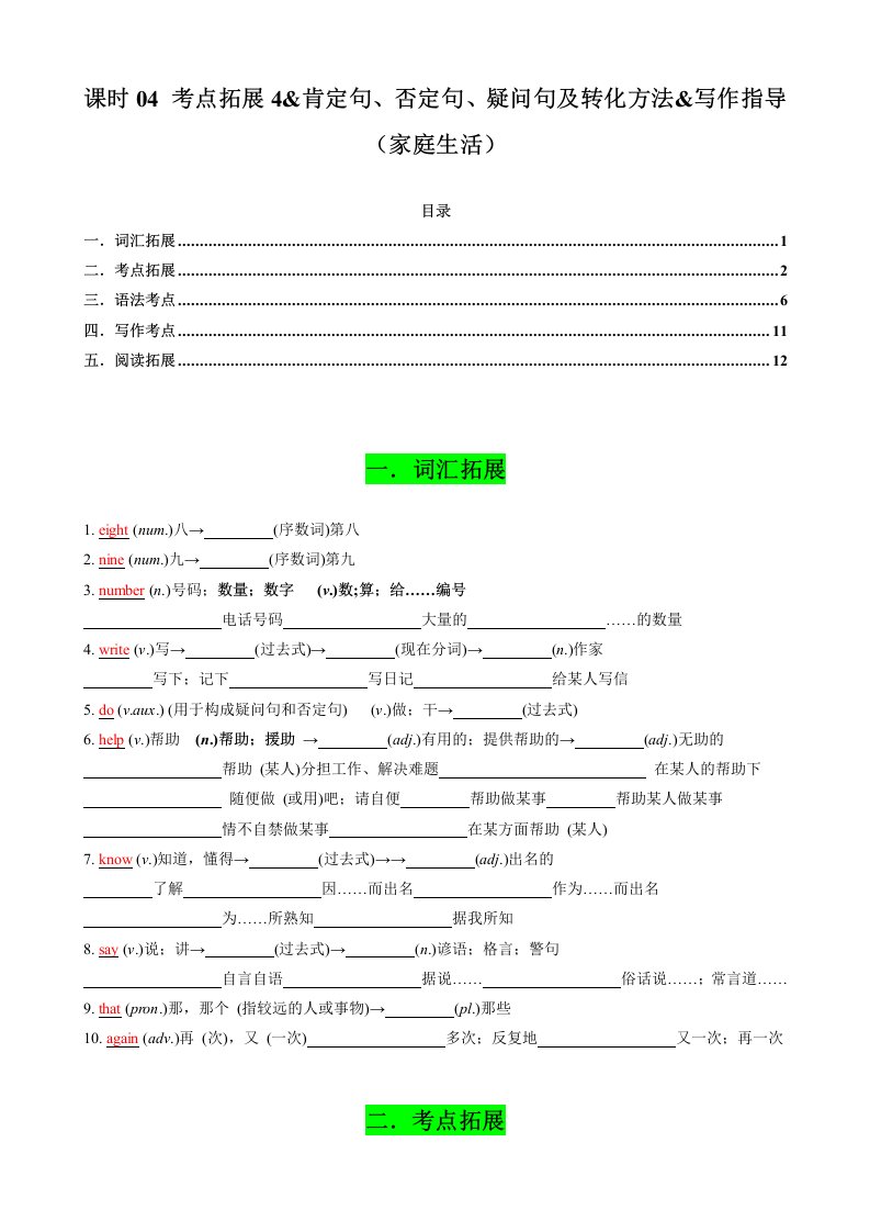 七下英语专题04 考点拓展4&肯定句、否定句、疑问句及转化方法&写作指导(家庭生活)(含答案)QXYYRJ-0301