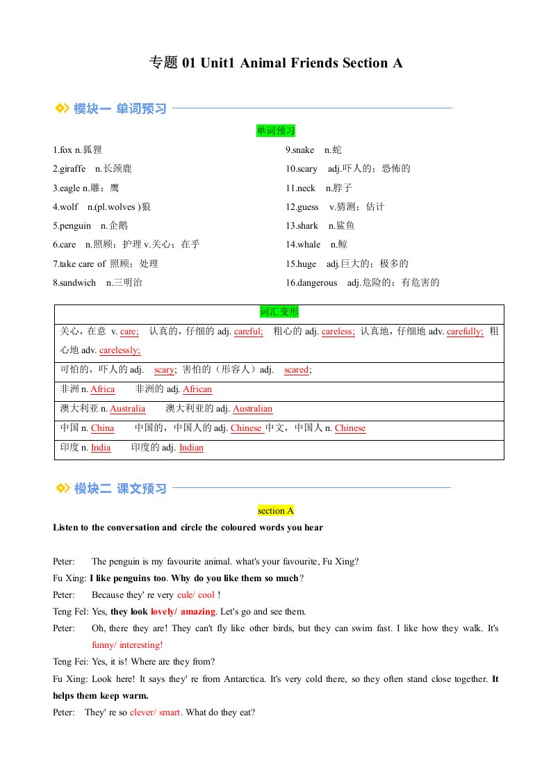 七下英语专题01 Unit1 Animal Friends Section A(含答案)QXYYRJ-0280