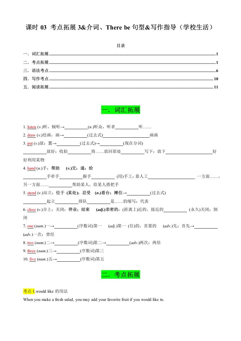 七下英语专题03 考点拓展3&介词、There be句型&写作指导(学校生活)(含答案)QXYYRJ-0295