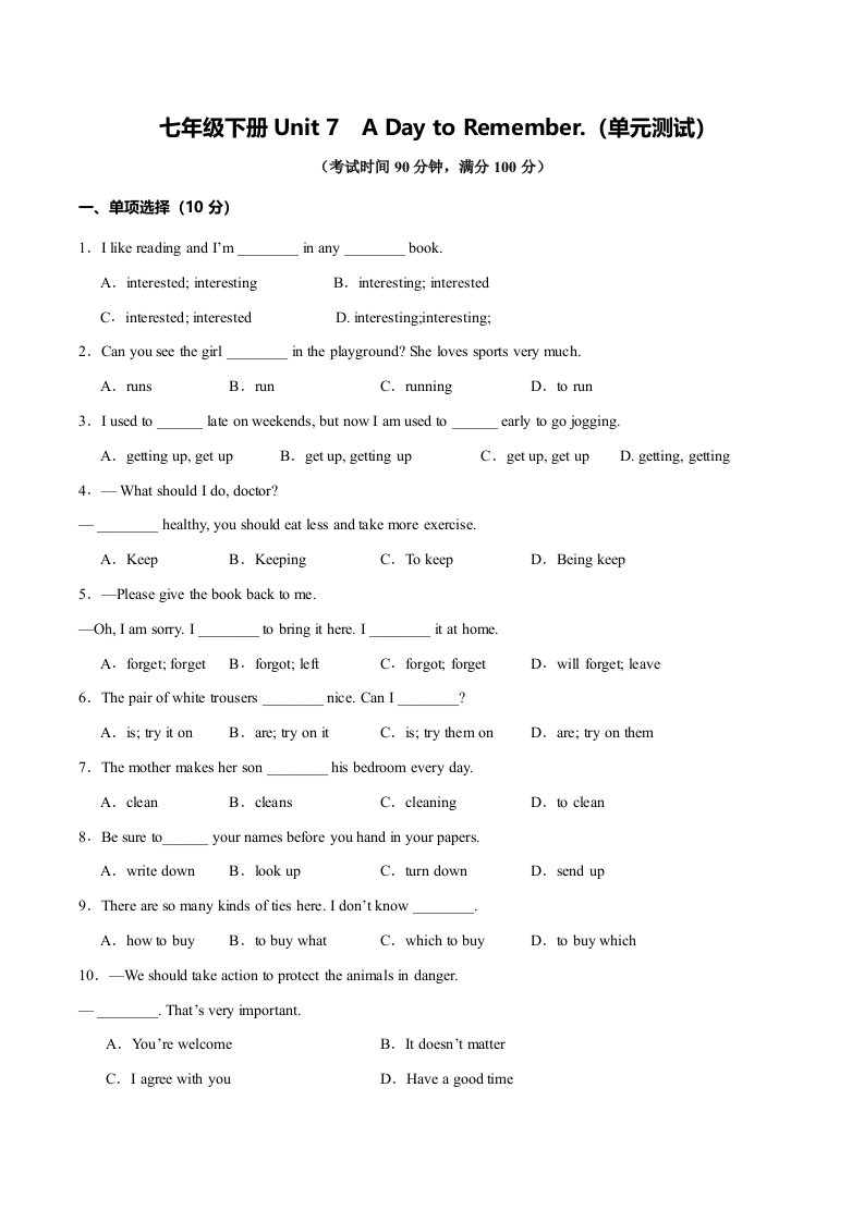 七下英语Unit 7 A Day to Remember. (单元测试)(含答案)QXYYRJ-0206