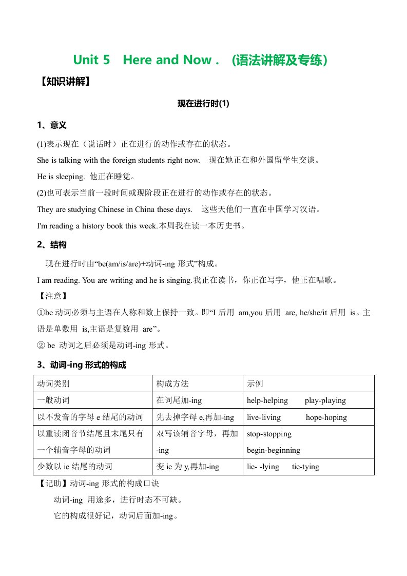 七下英语 Unit 5 Here and Now.(语法讲解及专练)(含答案)QXYYRJ-0169