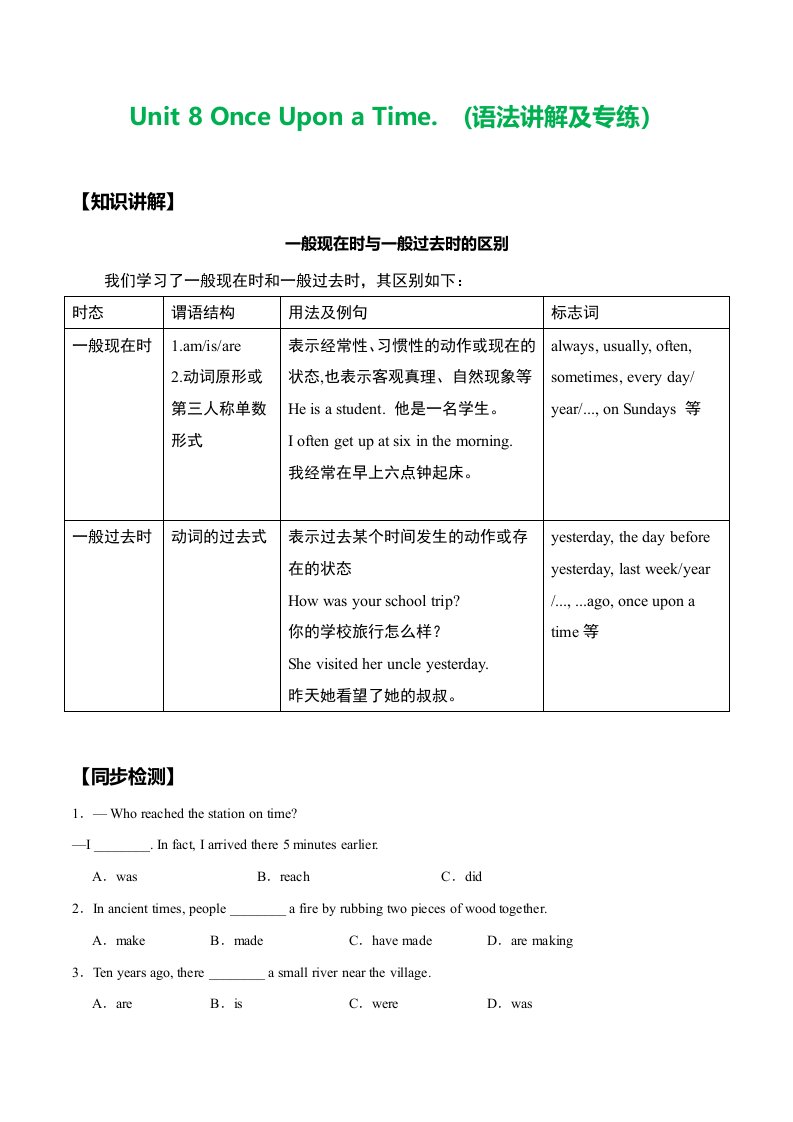 七下英语 Unit 8 Once Upon a Time.(语法讲解及专练)(含答案)QXYYRJ-0175