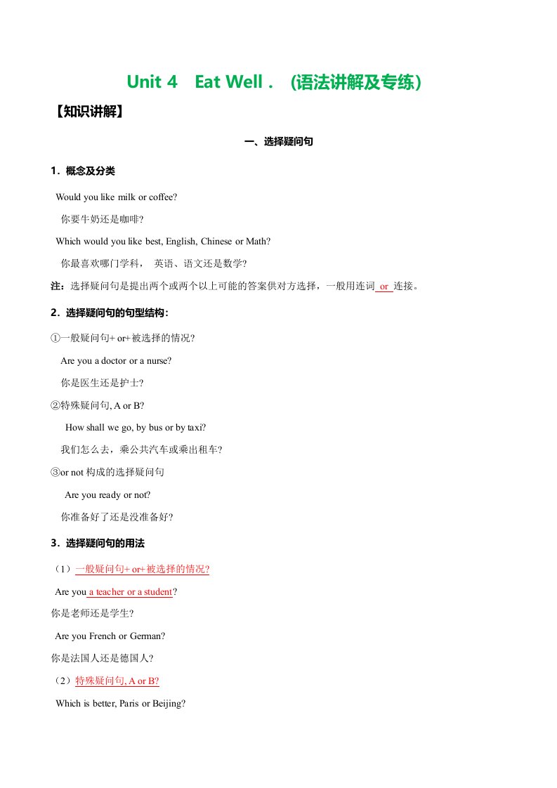 七下英语 Unit 4 Eat Well.(语法讲解及专练)(含答案)QXYYRJ-0167
