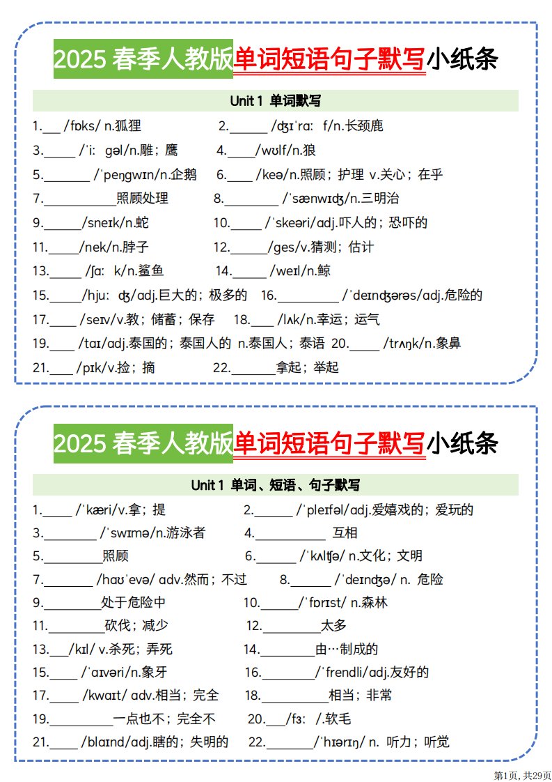 七下英语 人教版单词短语句子默写小纸条【含答案】QXYYRJ-0179
