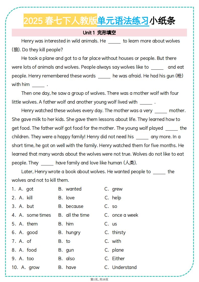 语法填空2025春七下人教版单元语法练习小纸条QXYYRJ-0185