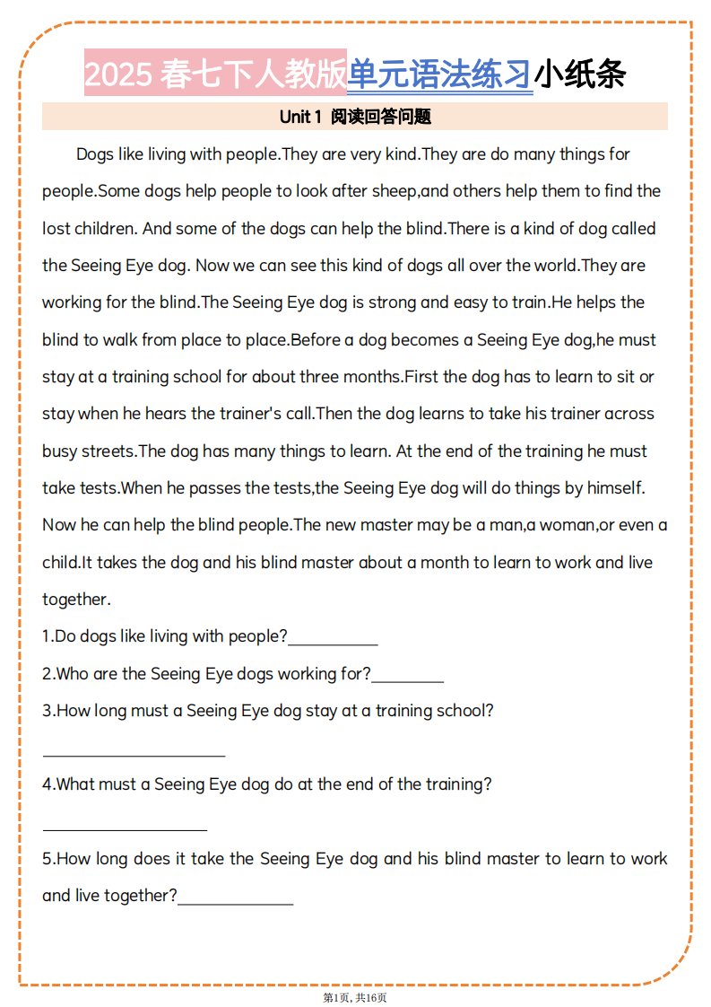 阅读回答问题2025春七下人教版单元语法练习小纸条QXYYRJ-0186