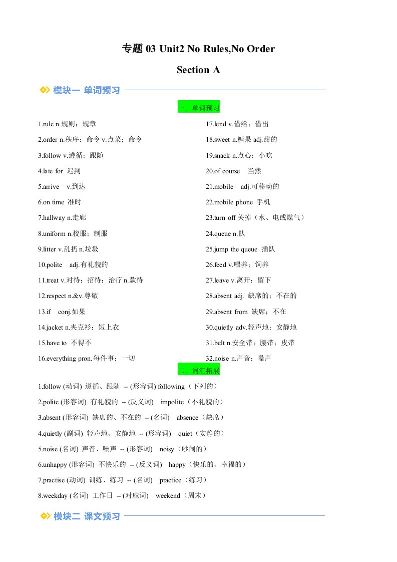 Unit 2 No Rules,No Order .(知识讲解)-七年级新教材英语下册基础知识专项讲练(人教版)QXYYRJ-0154