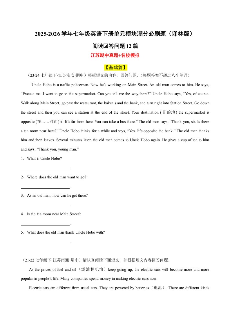 七下英语 阅读回答问题12篇-(译林版)(含答案)QXYYYL-0506