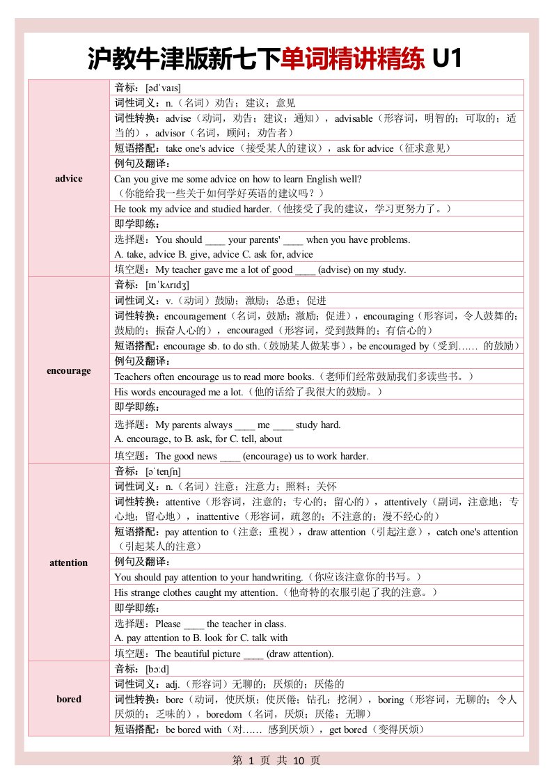 新七下英语沪教牛津 单词精讲精练U1(含答案)QXYYHJ-0065