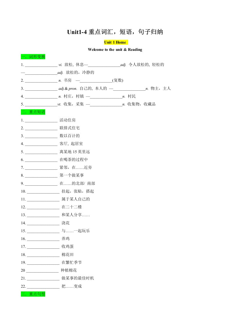 七下英语译林 考点清单01 Unit1-4重点词汇,短语,句子归纳(含答案)