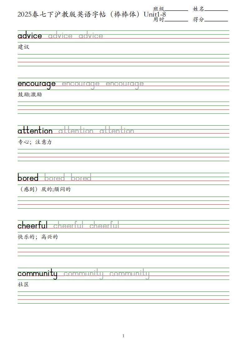 七下英语沪教牛津 英语字帖(不同字体)Unit1-8 QXYYHJ-0059