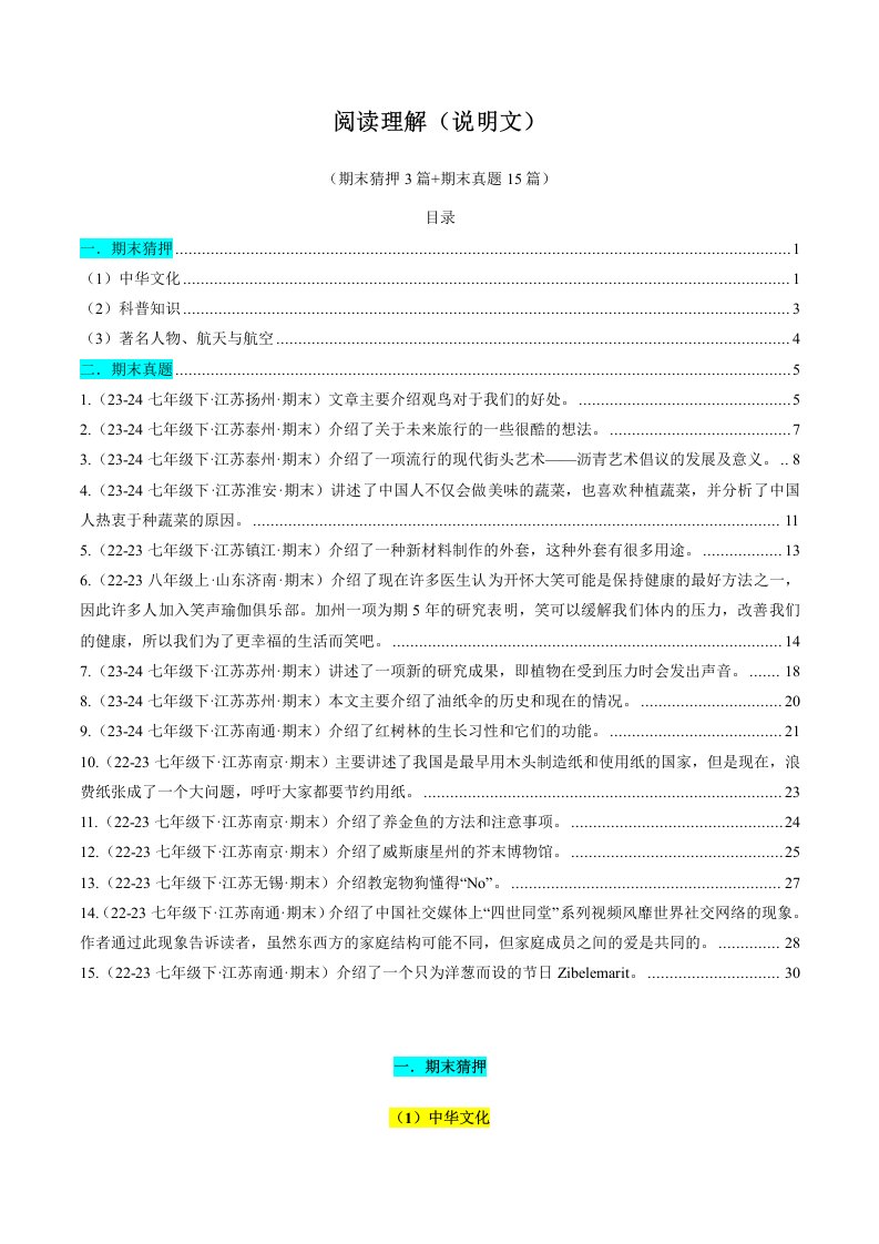 七下英语 译林 专题06 阅读理解(说明文) (期末必刷18 篇)(含答案)QXYYYL-0520