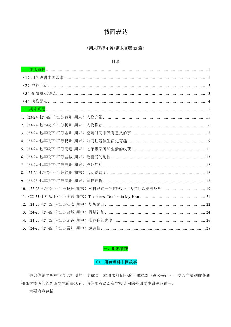 七下英语 译林 专题10 书面表达 (期末必刷19篇)(含答案)QXYYYL-0528