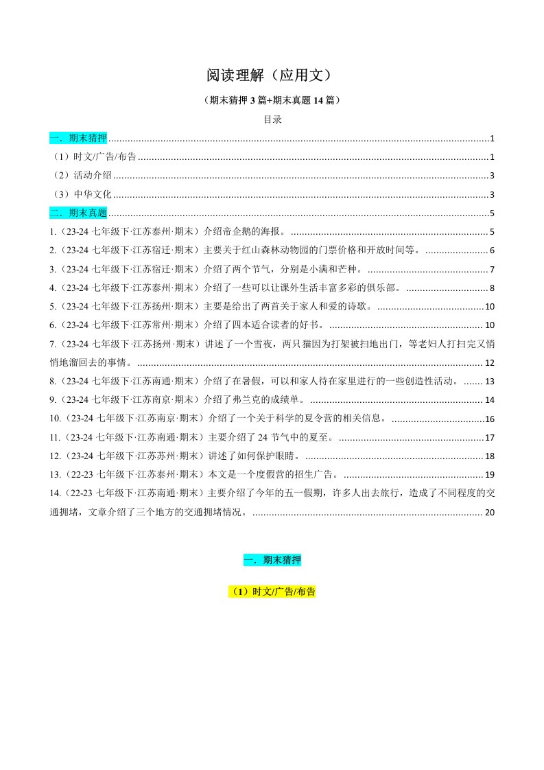 七下英语 译林 专题04 阅读理解(应用文) (期末必刷17篇)(含答案)QXYYYL-0516
