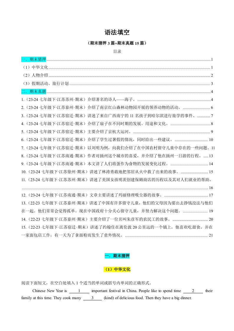 七下英语 译林 专题09 语法填空 (期末必刷18篇)(含答案)QXYYYL-0526