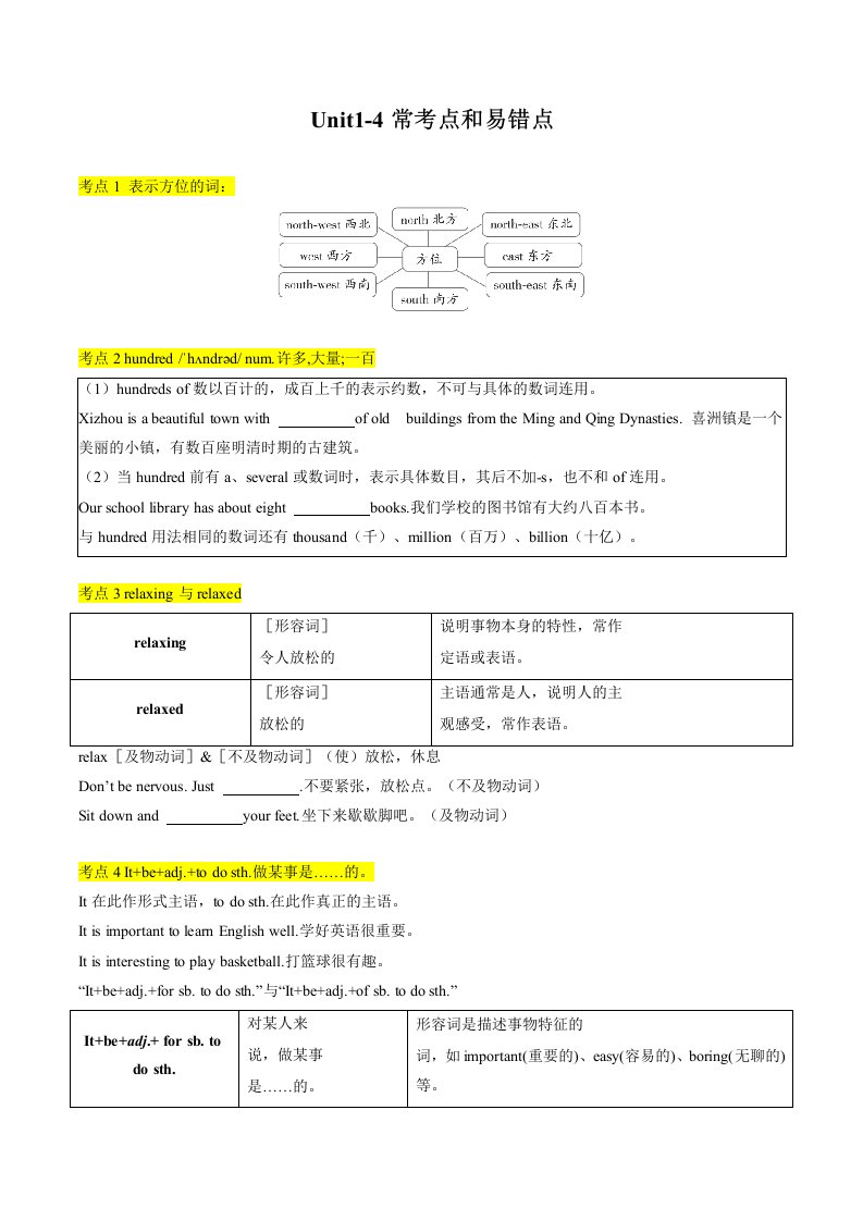 七下英语译林 考点清单03 Unit1-4常考点和易错点(含答案)