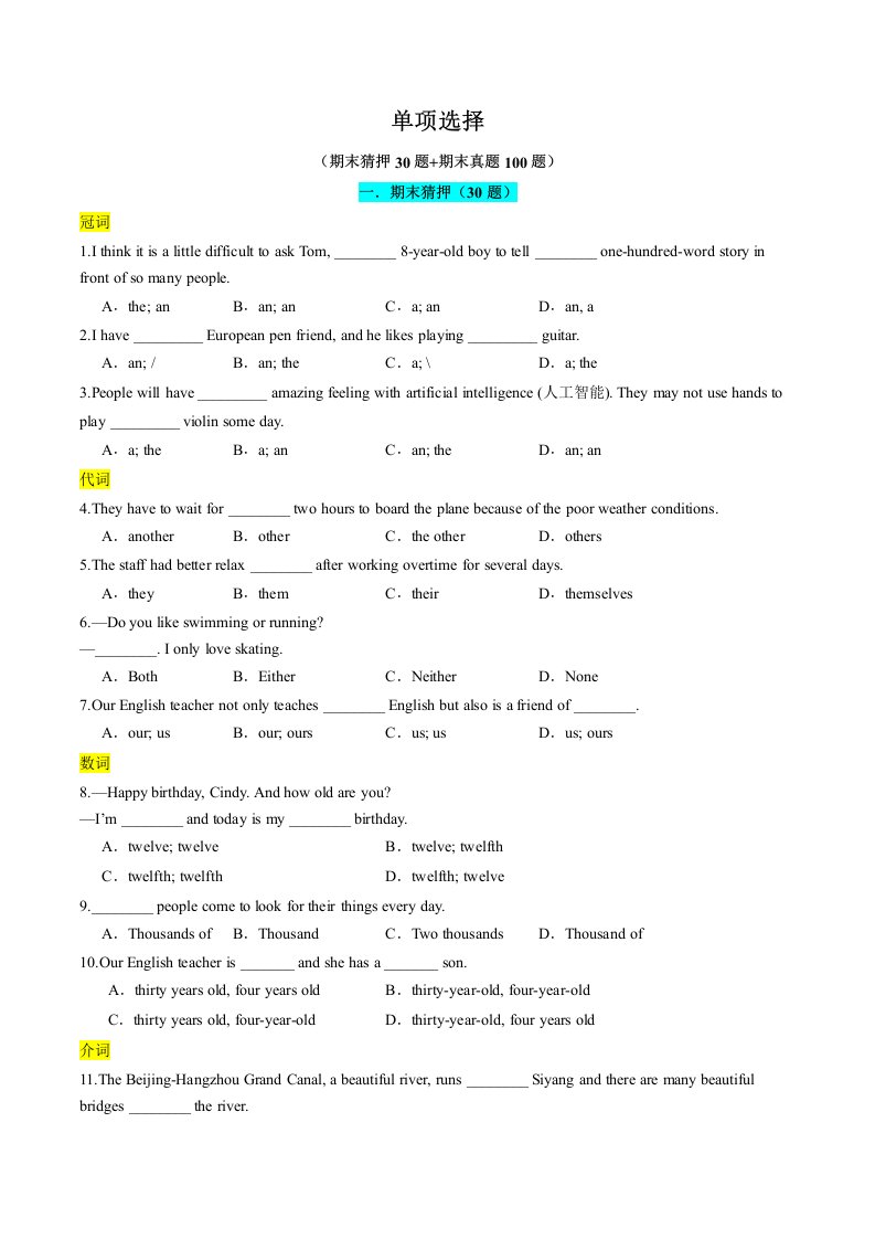 七下英语 译林 专题01 单项选择 (期末必刷130题)(含答案)QXYYYL-0510