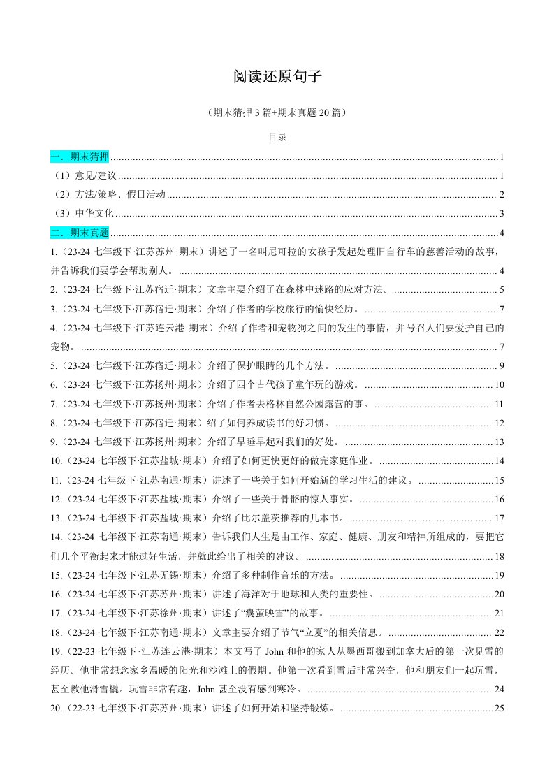 七下英语 译林 专题07 阅读还原句子 (期末必刷23篇)(含答案)QXYYYL-0522