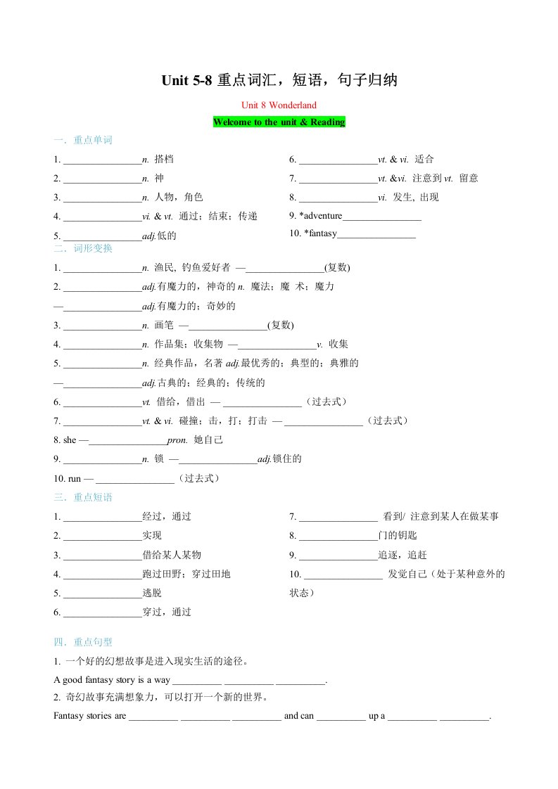 七下英语译林 考点清单04 Unit 5-8重点词汇,短语,句子归纳(含答案)